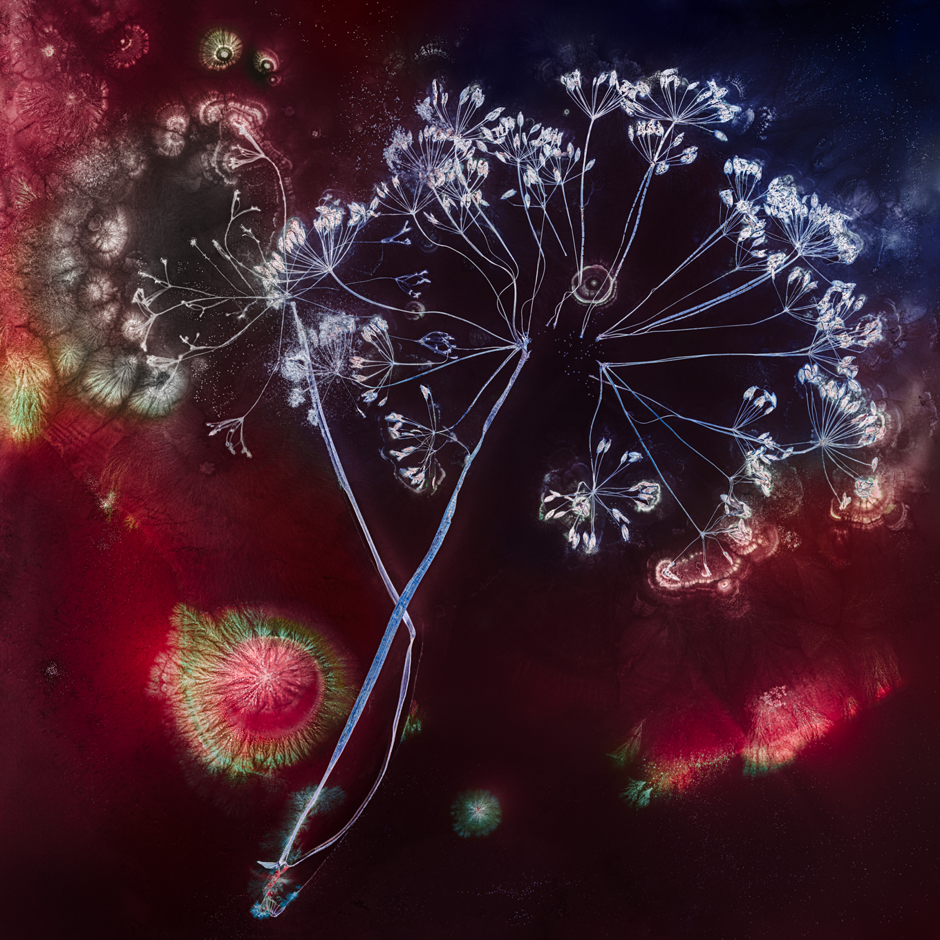 In earlier projects by Kathrin Linkersdorff (Wabi-Sabi, Floriszenzen and Fairies), very elaborately dried and chemically decoloured plants embodied the Japanese aesthetic principle of Wabi-Sabi, which sees beauty in imperfection, transience and decay. For her, the extracted pigments are an expression of life in a special way. By combining decay and new growth, the Microverse project now visualises the full cycle of material flows in nature. In the microbiological laboratory, soil bacteria called Streptomyces coelicolor are grown to produce colourful antibiotic pigments on decoloured flowers of outstanding microstructural beauty. These microbial performances reveal what normally remains hidden in the dark soil – provided it is a healthy, living soil with decaying organic matter and an interactive community of microbes, fungi and small animals. On the stages of the petri dishes, these organic cycles of growth and decay create growing images of translucent, dead plants that blossom again under the spell of microbial pigments, merging science and art in a living theatrum naturae et artis.