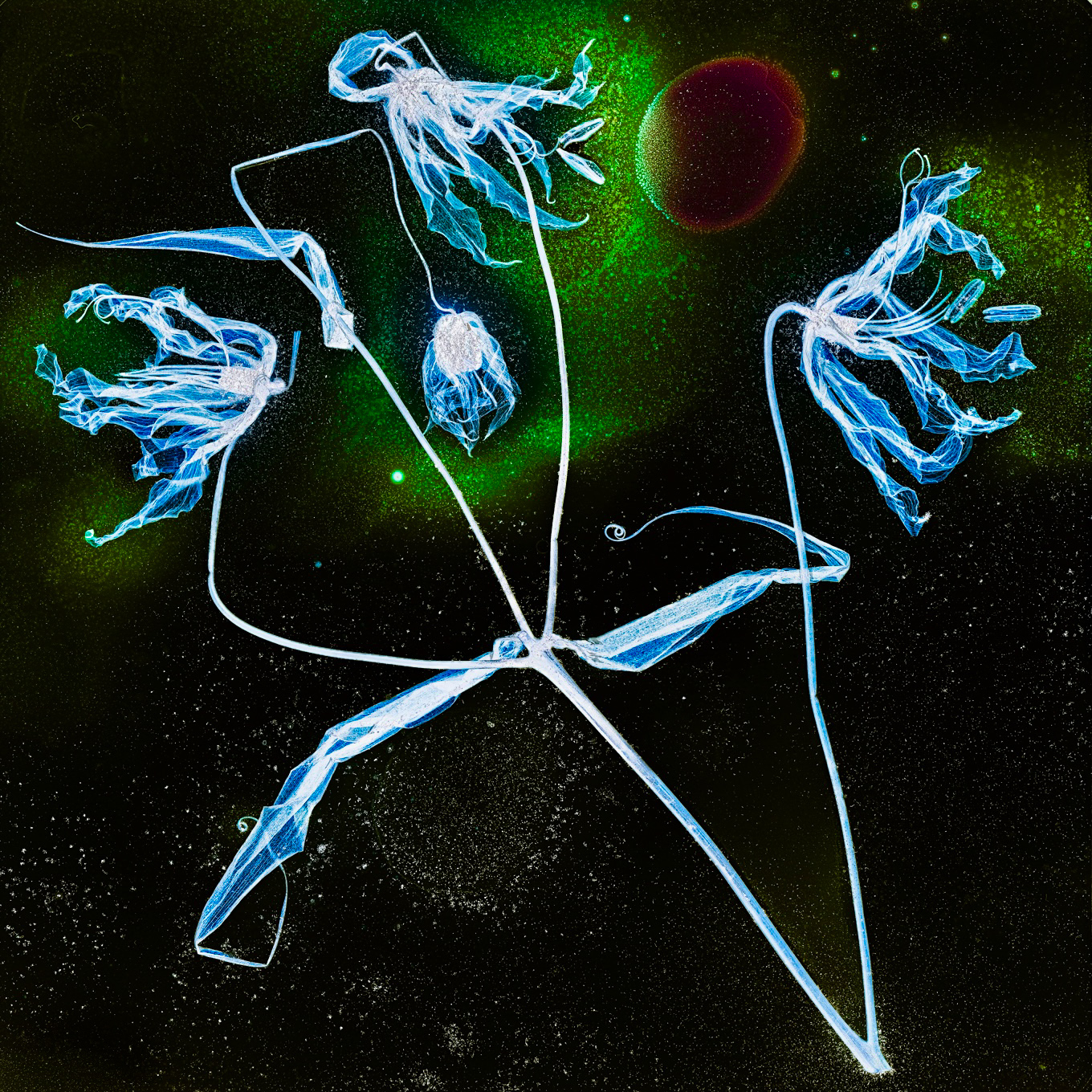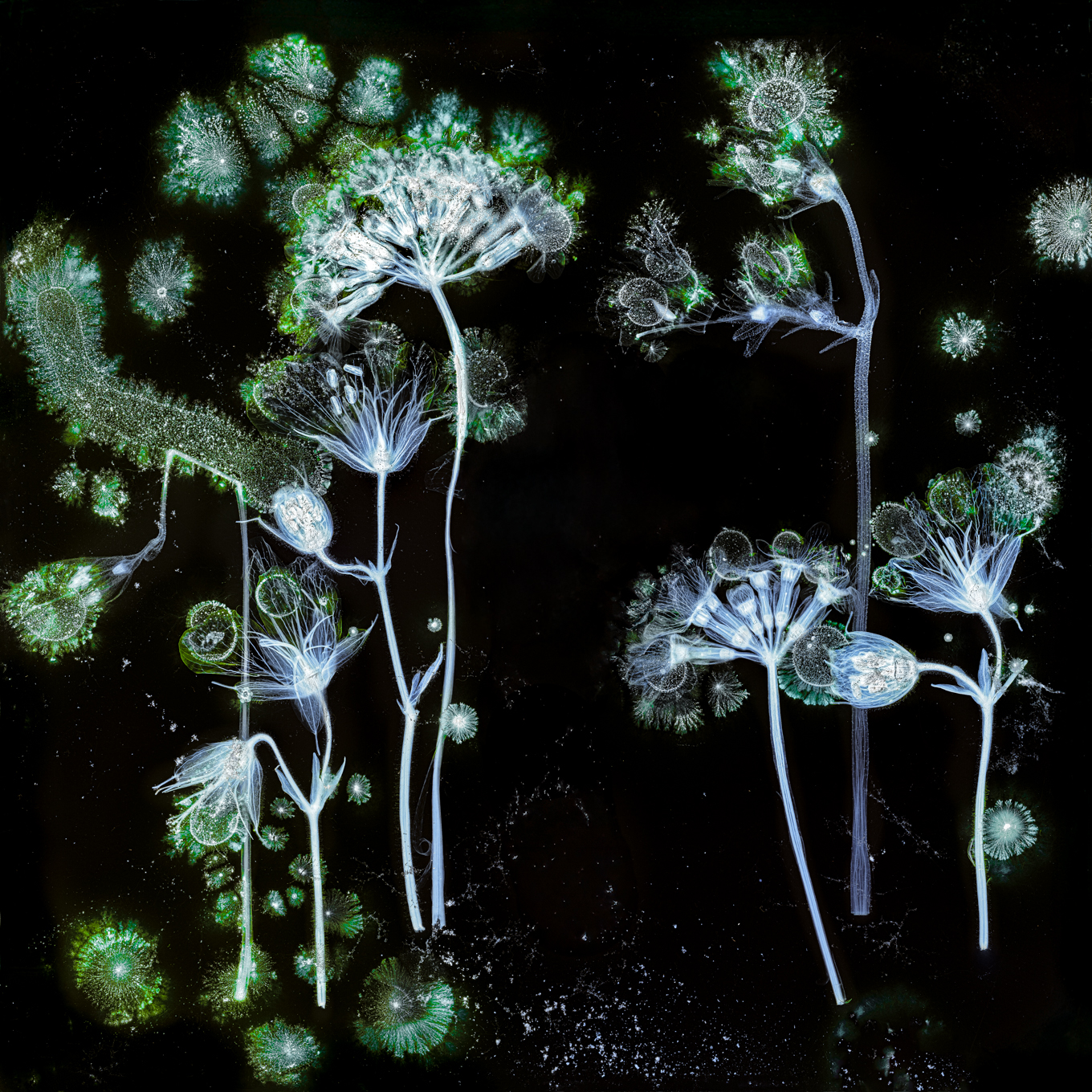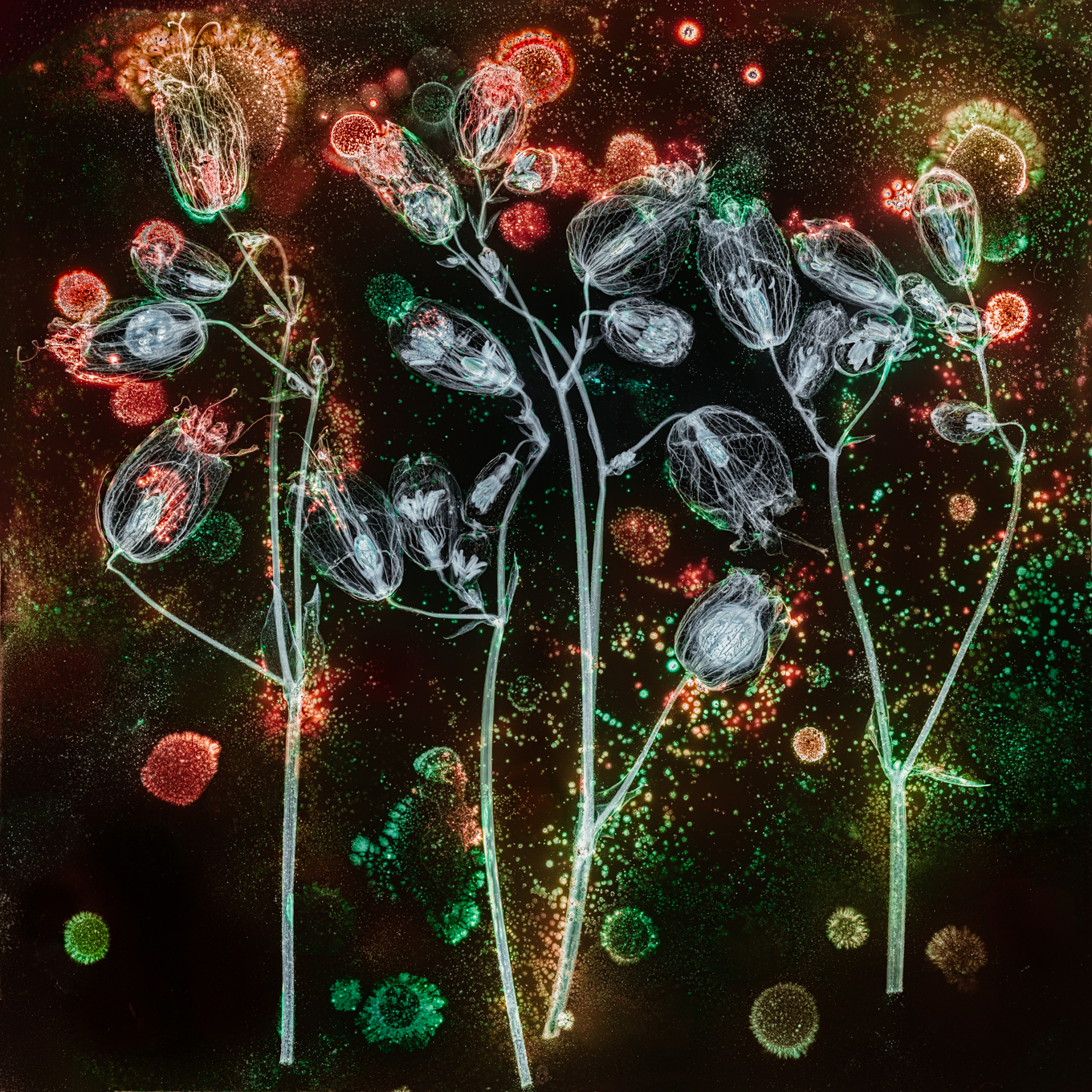 In earlier projects by Kathrin Linkersdorff (Wabi-Sabi, Floriszenzen and Fairies), very elaborately dried and chemically decoloured plants embodied the Japanese aesthetic principle of Wabi-Sabi, which sees beauty in imperfection, transience and decay. For her, the extracted pigments are an expression of life in a special way. By combining decay and new growth, the Microverse project now visualises the full cycle of material flows in nature. In the microbiological laboratory, soil bacteria called Streptomyces coelicolor are grown to produce colourful antibiotic pigments on decoloured flowers of outstanding microstructural beauty. These microbial performances reveal what normally remains hidden in the dark soil – provided it is a healthy, living soil with decaying organic matter and an interactive community of microbes, fungi and small animals. On the stages of the petri dishes, these organic cycles of growth and decay create growing images of translucent, dead plants that blossom again under the spell of microbial pigments, merging science and art in a living theatrum naturae et artis.